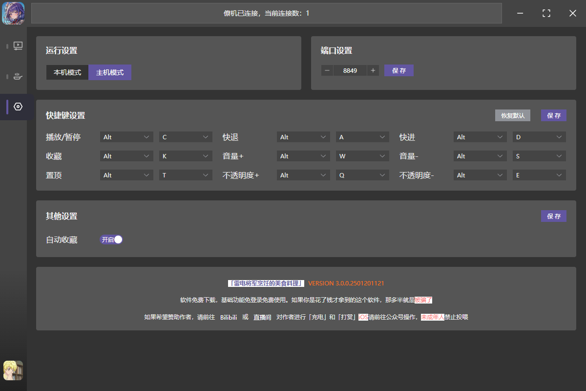 首先点击左侧导航栏的设置按钮,如果用户只是单机用户(指只有一台电脑)。只需要关心「快捷键设置」和「其他设置」这两个区域的设置内容。